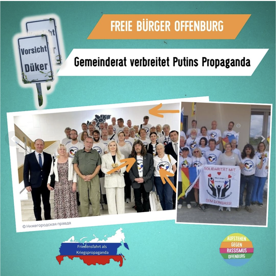 Unter anderem sollen dabei Bauteile für bewaffnete Drohnen an die Front geliefert worden sein. Als der Generalbundesanwalt 2024 einen Haftbefehl gegen Kilinc erließ, tauchte sie in Russland unter, wie „Monitor“ berichtet. Der ARD-Bericht zeigt unter anderem ein Foto der „Druschba“-Reisegruppe von 2024, auf dem neben Kilinc, Groß und Moser auch der Offenburger Stadtrat Fritz Düker zu sehen ist, der auf einem weiteren Foto zusammen mit der mutmaßlichen Agentin Kilinc die „Druschba“-Fahne präsentiert. In seinen Telegram-Kanälen bewirbt Düker die Veranstaltung im „Brandeck“ , wo auch die AfD regelmäßig ihren Stammtisch abhält, und betreibt damit auch weiterhin das schmutzige Geschäft der russischen Propaganda.